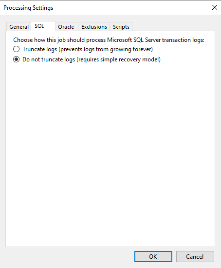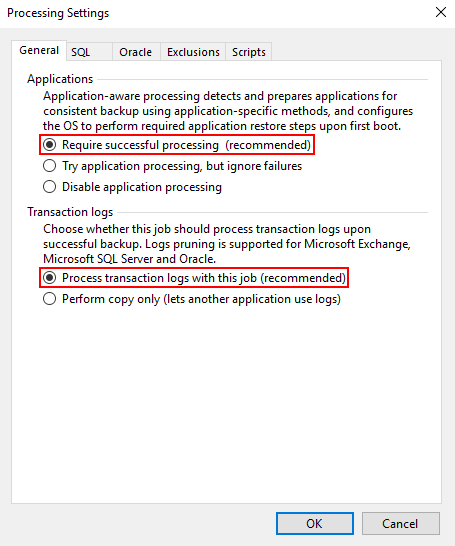 В окне Processing Settings на вкладке General: a. Установите переключатель Applications в положение Require successful processing для транзакционно-консистентной реплики приложений. b. Установите переключатель Transaction Logs в положение Process transaction logs with this job, если необходимо обрабатывать журналы транзакций СУБД (SQL или Oracle).