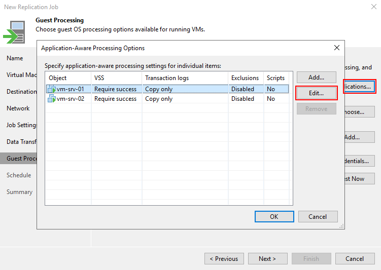 В окне Application-Aware Processing Options выберите VM и нажмите на кнопку Edit.