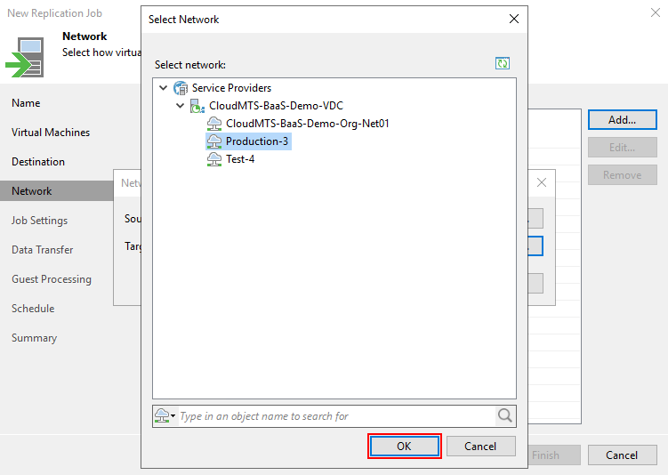 В окне Select Network выберите целевую виртуальную сеть, которую VM будут использовать в облаке, нажмите на кнопку OK.