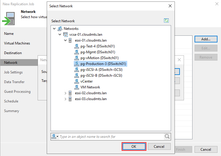 В окне Select Network выберите исходную порт-группу, которую используют VM на текущей площадке. нажмите на кнопку OK.