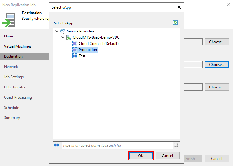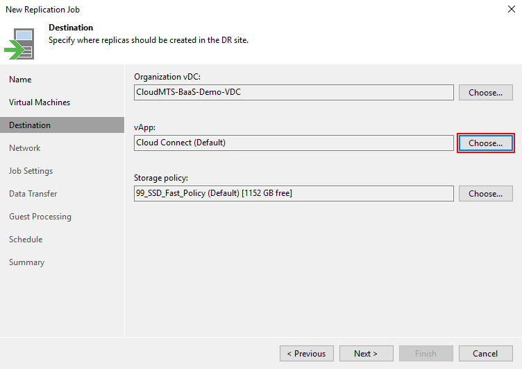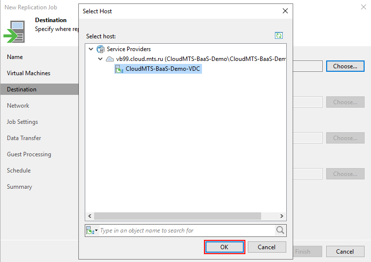 Нажмите на кнопку Choose для поля Host or cluster и выберите Cloud host для репликации в облако.