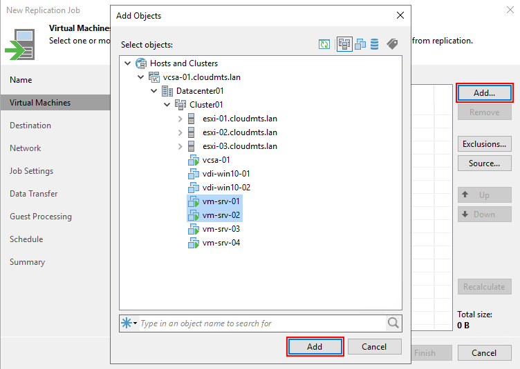 В окне Add Objects выберите VM для репликации и нажмите на кнопку Add.