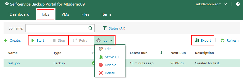 Управление заданием осуществляется на вкладке Job панели Veeam Enterprise Manager.