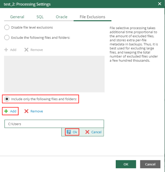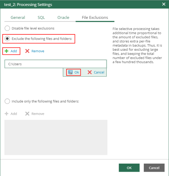 - Количество записей в списке исключений или включений не должно превышать несколько сотен. Это влияет на производительность задания: чем больше файлов включается или исключается из резервной копии, тем больше времени Veeam Backup & Replication требуется для обработки данных файлов.