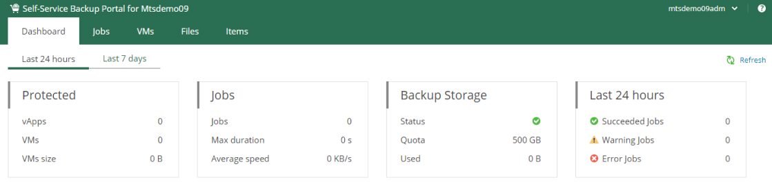 | Dashboard | Общая статистика по операциям и объектам резервного копирования, доступному дисковому пространству в выделенном репозитории |