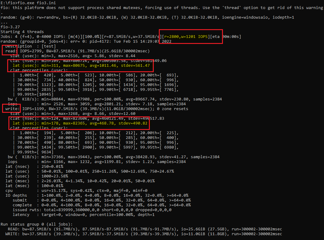 rw=randrwЗапустите тест FIO, указав конфигурационный файл. При первом запуске FIO сначала сформирует на указанном диске требуемое количество job–файлов заданного объёма, затем произведёт нагрузочное тестирование в течение указанного времени. Повторный запуск теста будет использовать имеющиеся файлы, если их параметры не были изменены в конфигурационном файле.