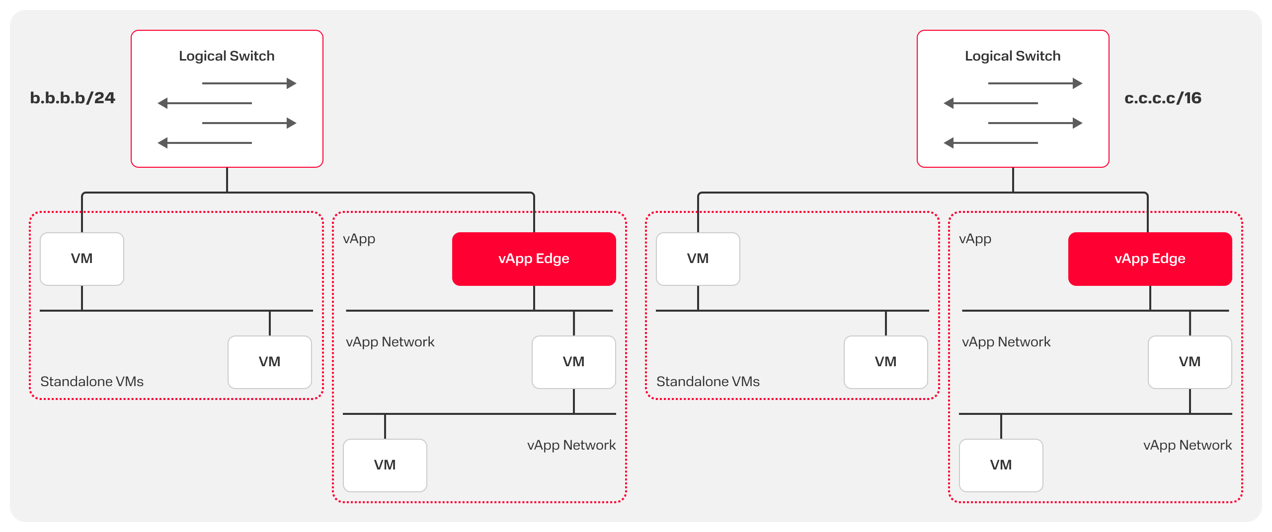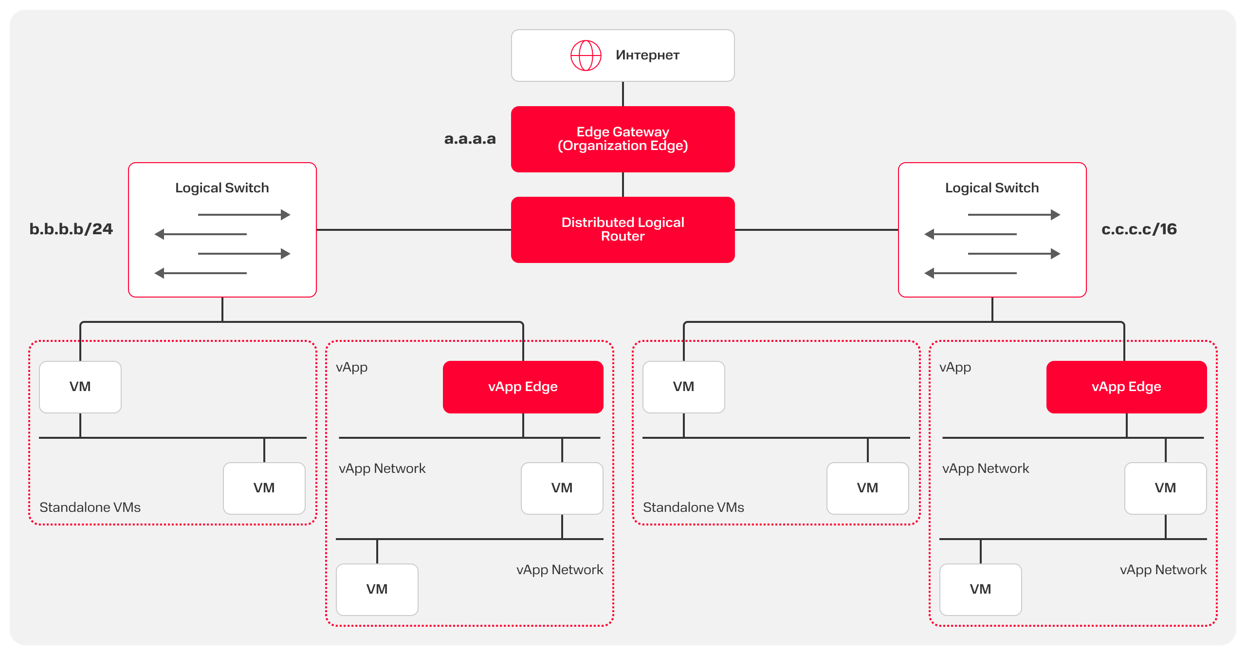 Logical Switch– логический сетевой коммутатор;b.b.b.b/24иc.c.c.c/16— примеры адресов внутренних изолированных сетей.