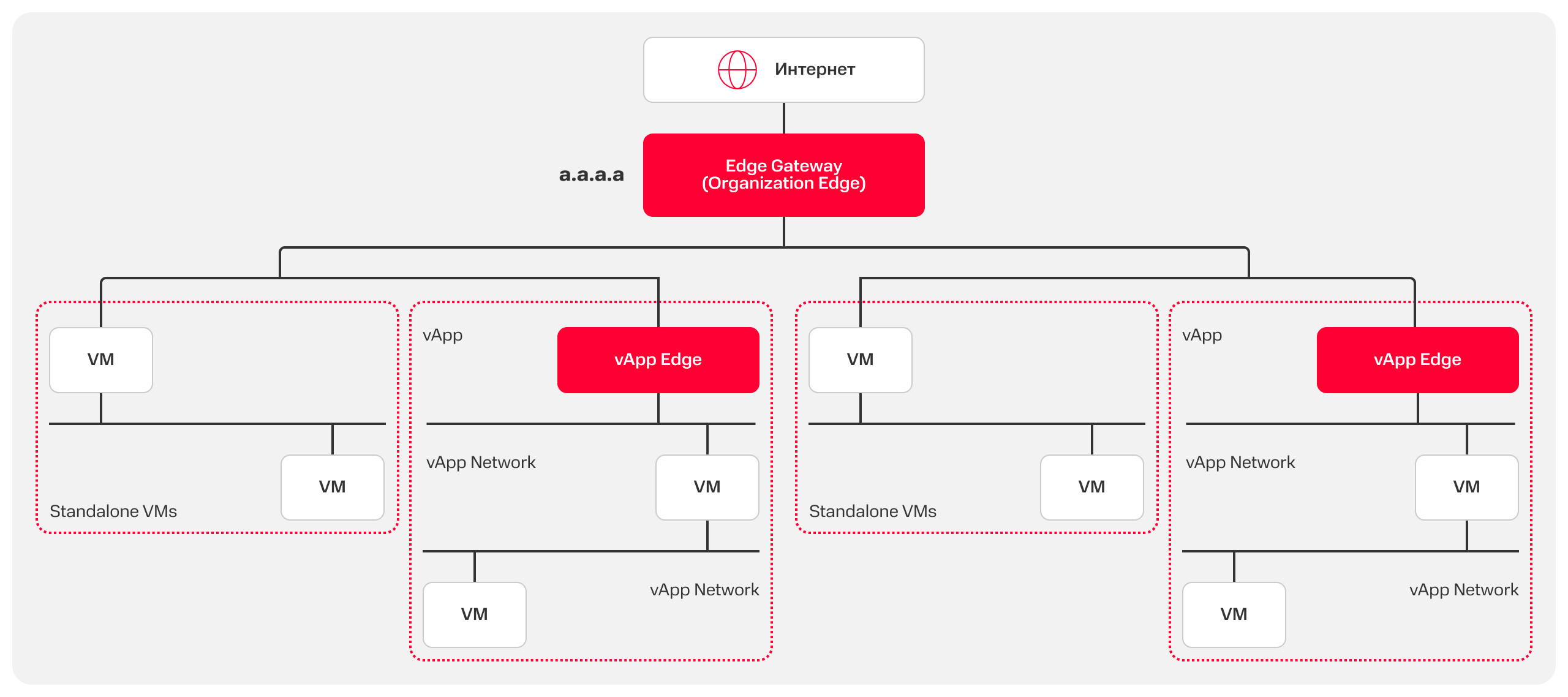 Настройки виртуальной сети включают определение маршрута на Edge Gateway и правил фильтрации трафика на межсетевом экране. Edge Gateway — программный маршрутизатор, виртуальный шлюз. Через него виртуальные машины получают доступ в сеть, в том числе в сеть Интернет. vApp Edge выполняет те же функции, только для vApp.
