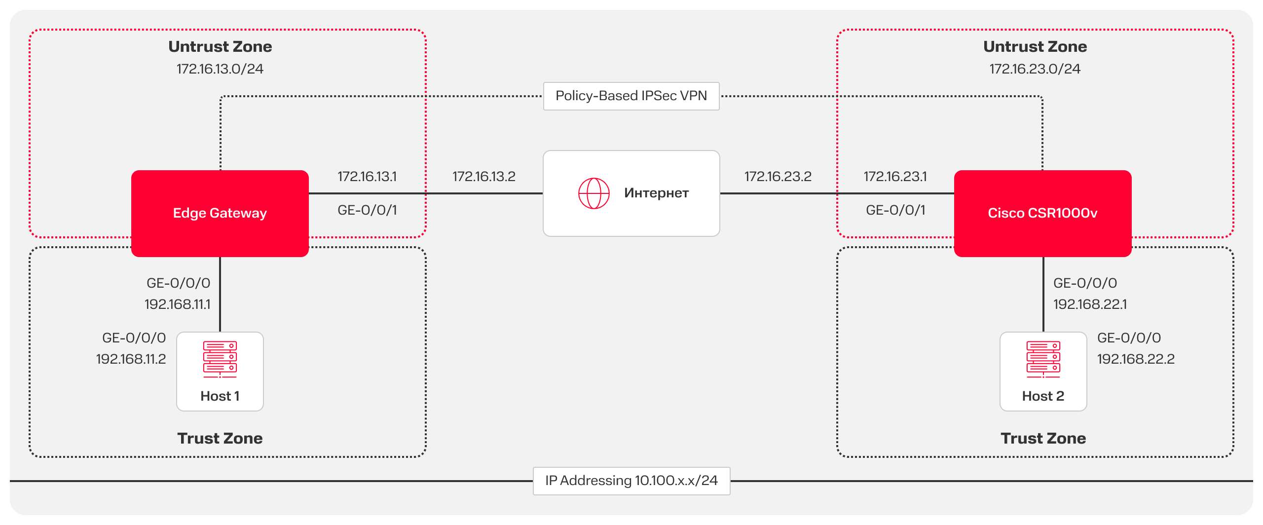 В данной статье описана настройка Policy-Based IPSec VPN между оборудованием Cisco CSR1000v и виртуальным шлюзом Edge Gateway.